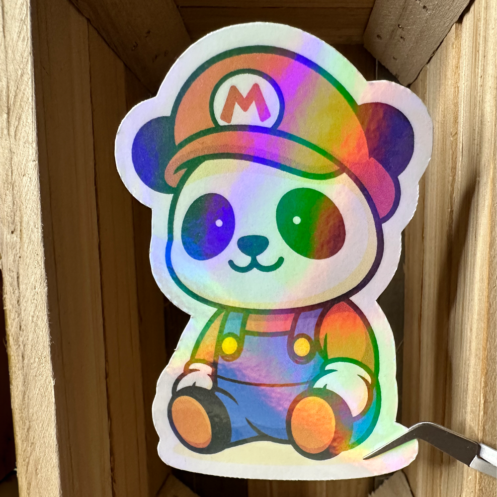 Dieser holografisch glänzende AGMW-Panda Sticker kombiniert süßen Charakter-Vibe mit einem coolen Overall-Look. Der Sticker schimmert je nach Lichteinfall in Regenbogen Farben